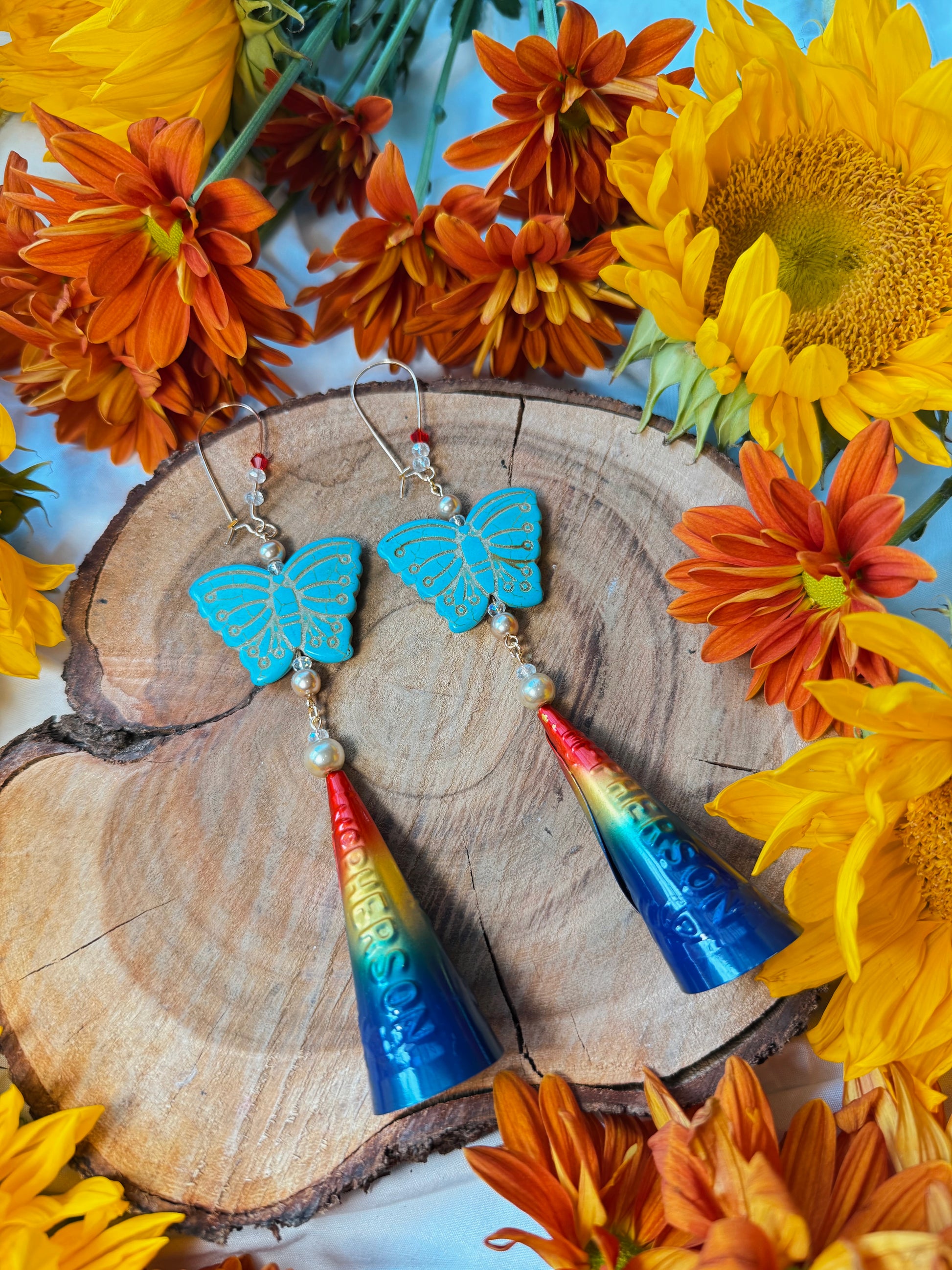 Each piece is beautifully crafted with glass pearls, reconstructed howlite butterflies, Czech beads, and old style ombré rainbow adult sized jingle cones.