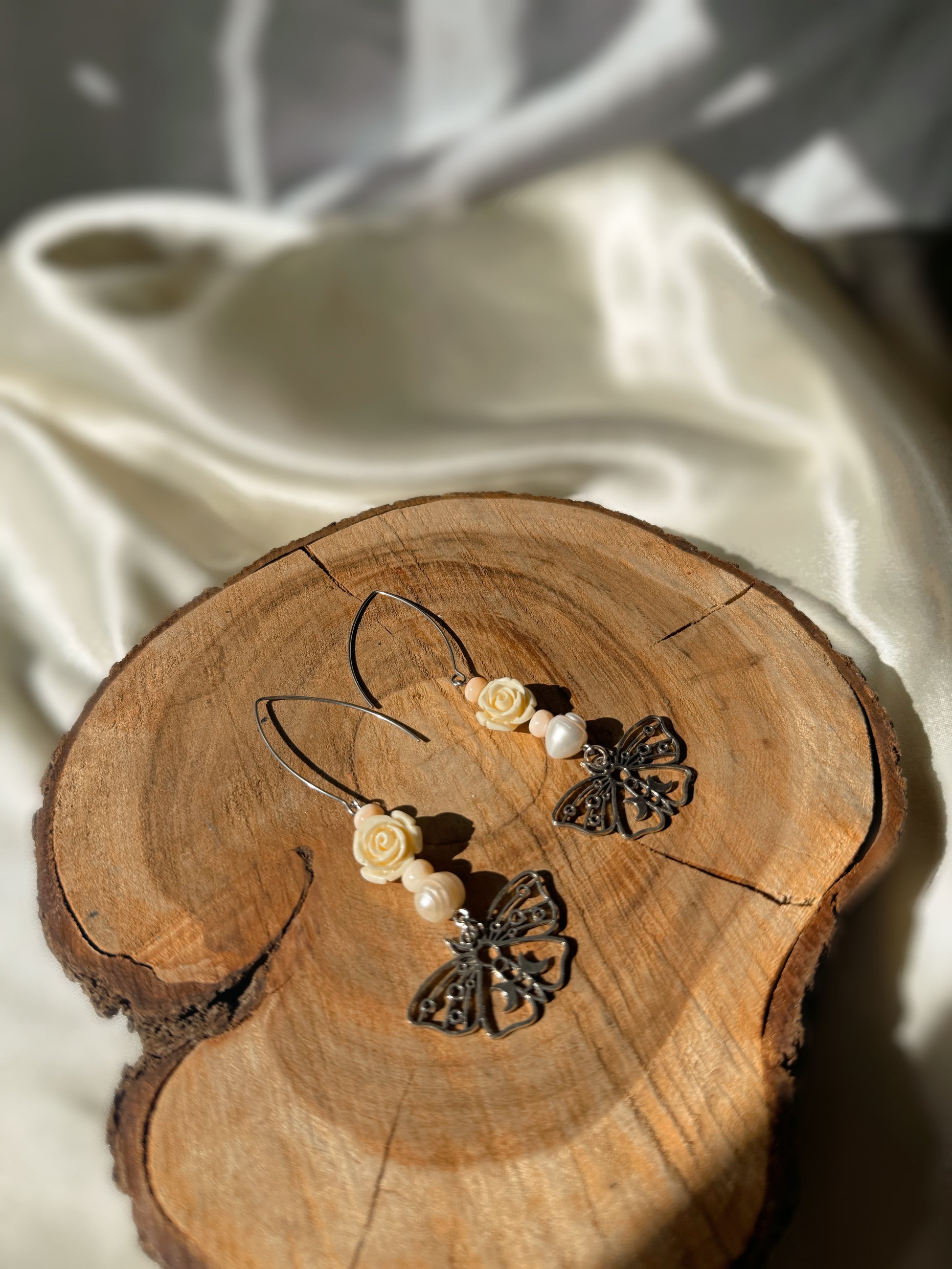 Moth Earrings with Pearl & Pink Conch Beads