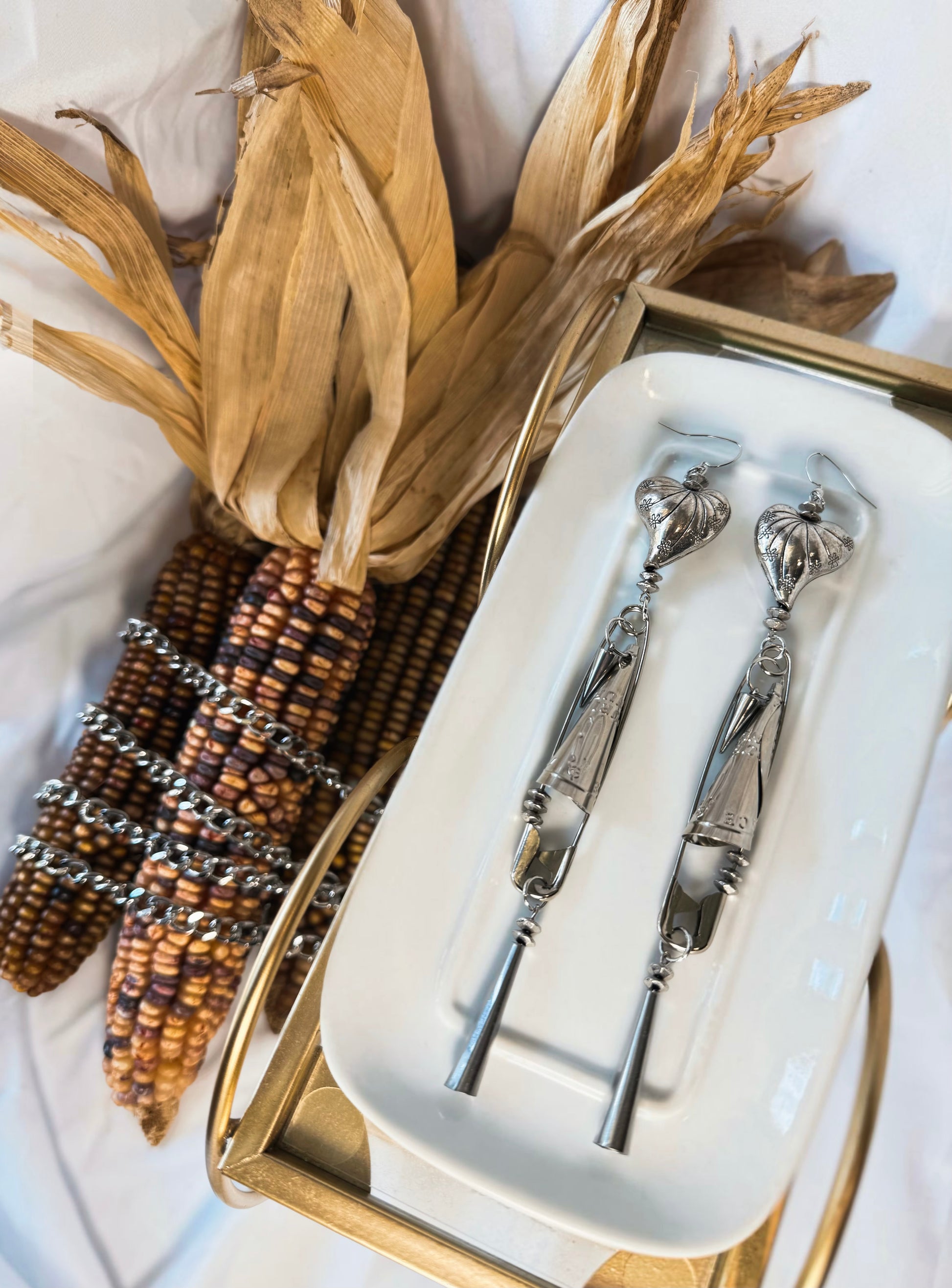 Moth To The Flvme safety pin jingle earrings featuring antique silver plated rondelle beads, antique carved silver heart accents, sterling silver spikes, and silver cones.