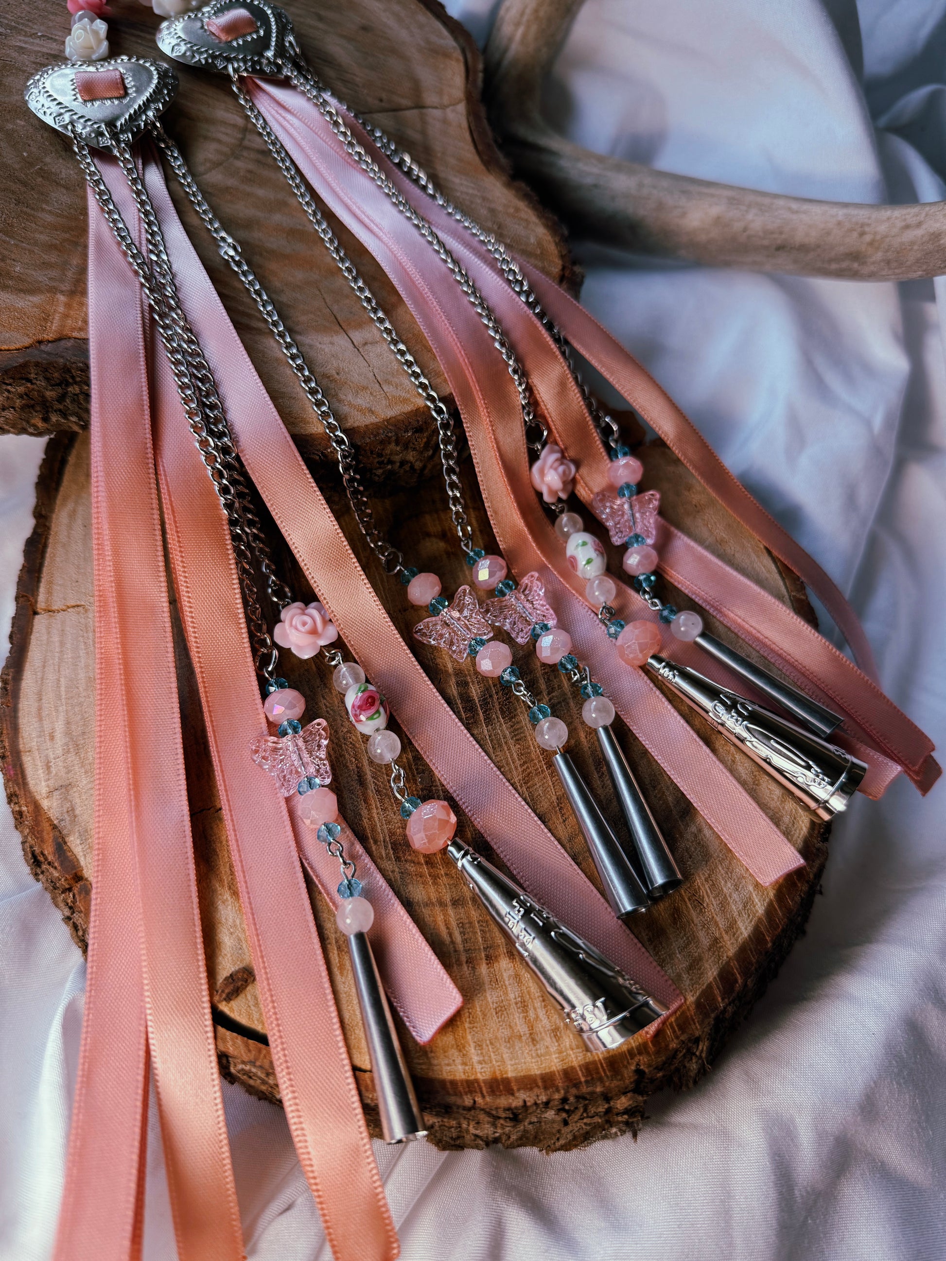 Adorned with rose quartz, glass rose beads, blue faceted crystal beads, roses, pink Aurora Borealis glass accents, and butterfly beads.